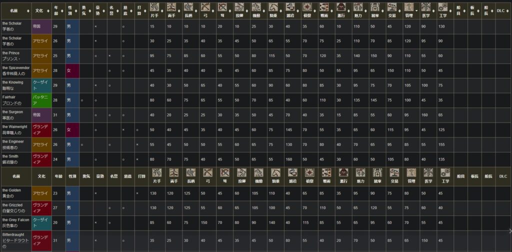弓>乗馬>偵察>魅力>運動>統率>悪行>両手>片手>鍛冶>交易